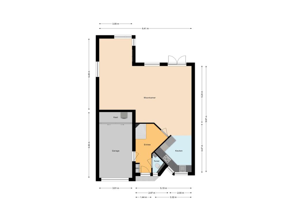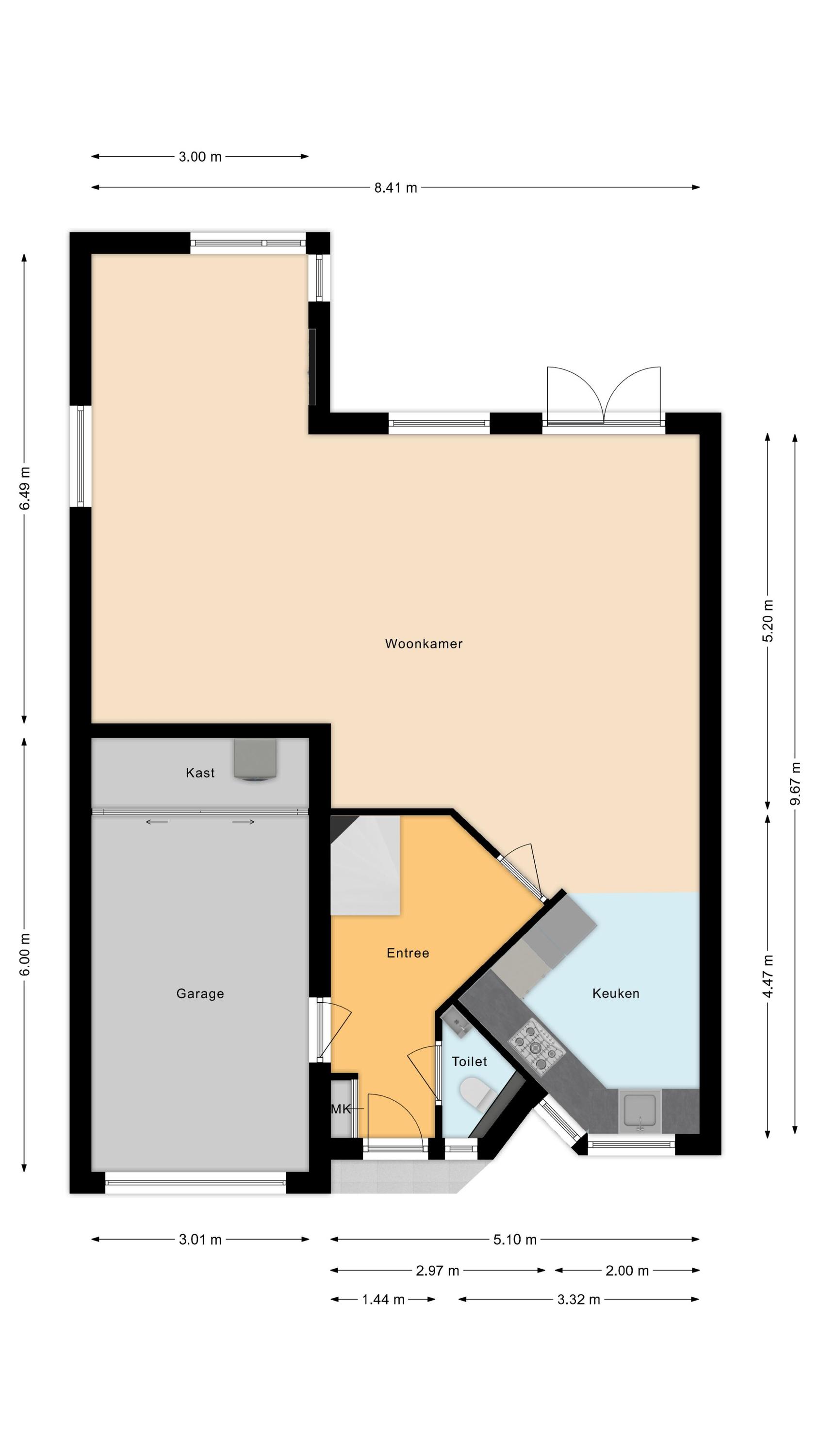 - Woonkamer : 6.49 x 3.00 + 5.20 x 5.41