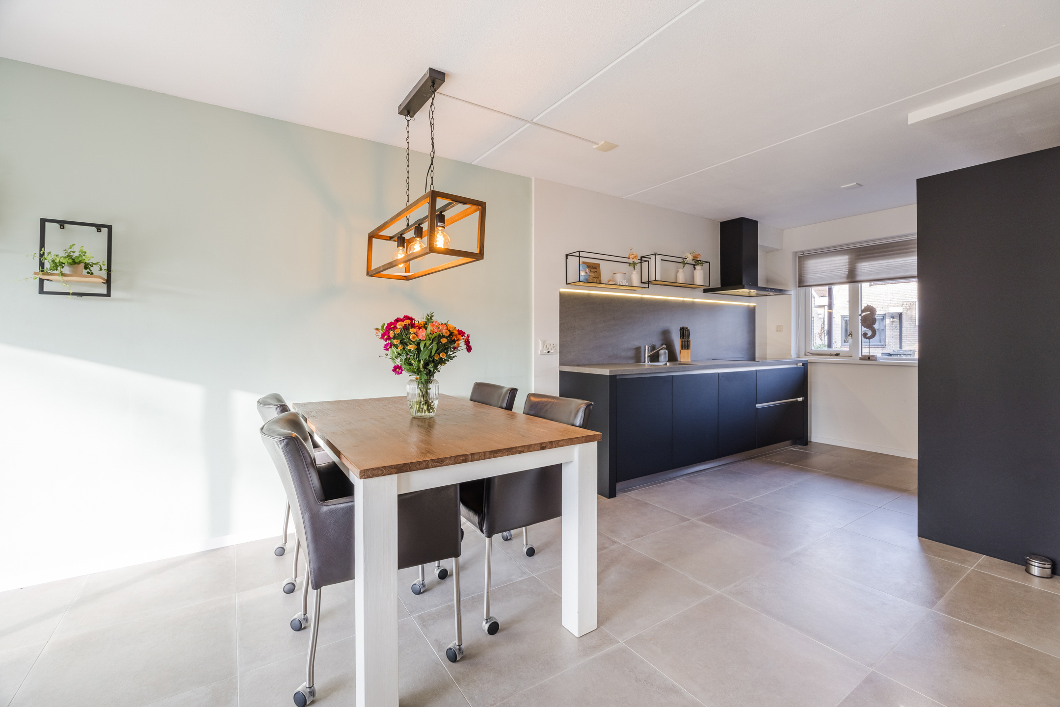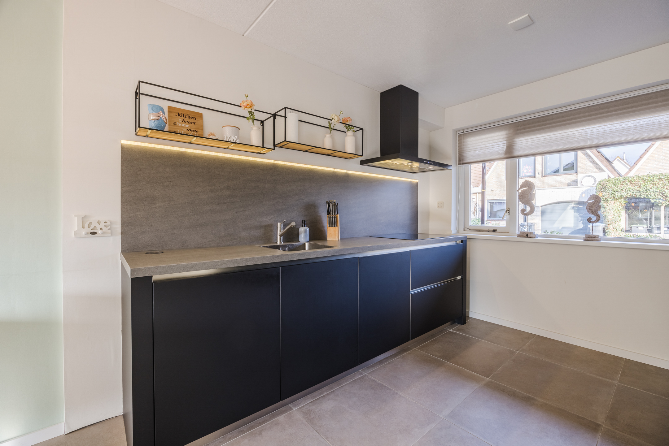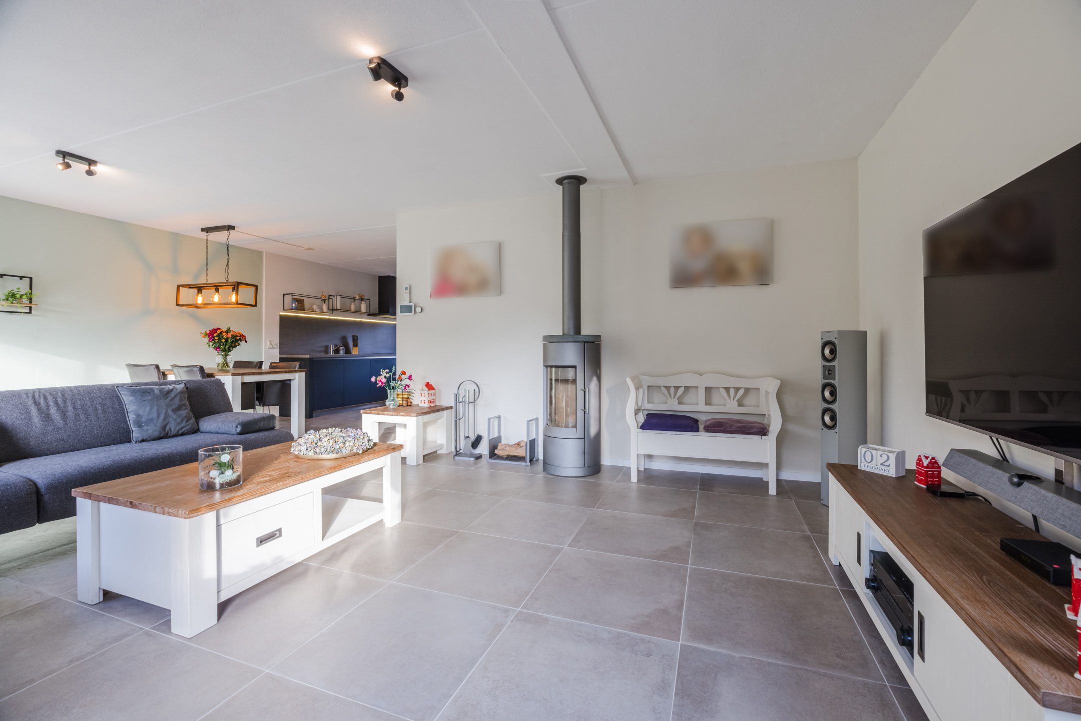 De ruime, uitgebouwde woonkamer profiteert van veel daglicht dankzij de schuifpui aan de achterzijde en het zijraam. De houtkachel zorgt voor extra sfeer, terwijl de airconditioning voor verkoeling zorgt op warme dagen. Aan de voorzijde van de woning bevindt zich de open keuken, compleet uitgerust met inbouwapparatuur zoals een inductiekookplaat, afzuigkap, koelkast, vriezer, combioven, stoomoven en een vaatwasser. De gehele begane grond is afgewerkt met een plavuizenvloer met vloerverwarming.