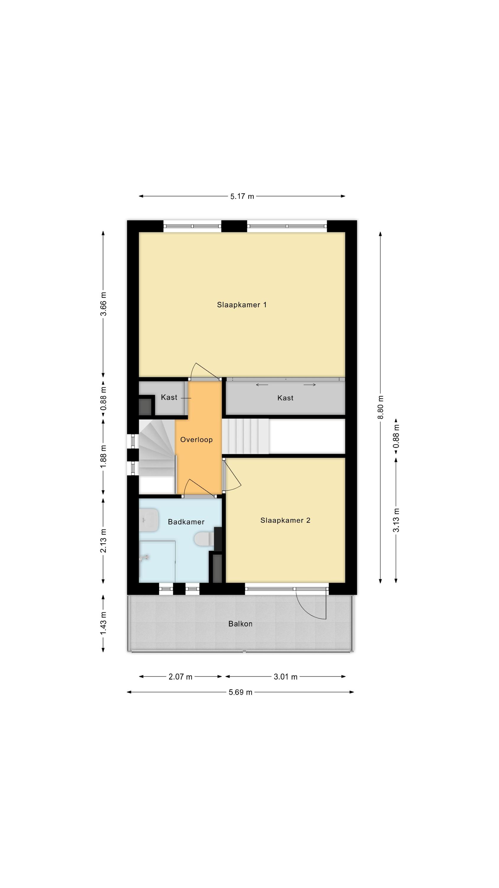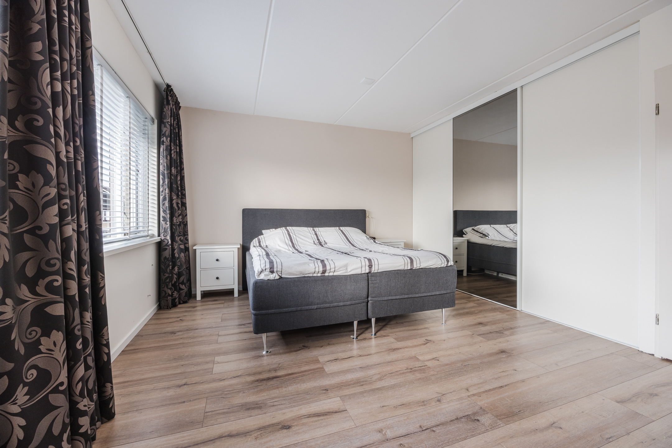 Overloop met vaste kast en toegang tot twee slaapkamers en de badkamer. De slaapkamer aan de achterzijde is bijzonder ruim en beschikt over een inloopkast met schuifdeuren. De slaapkamer aan de voorzijde heeft toegang tot een eigen balkon.