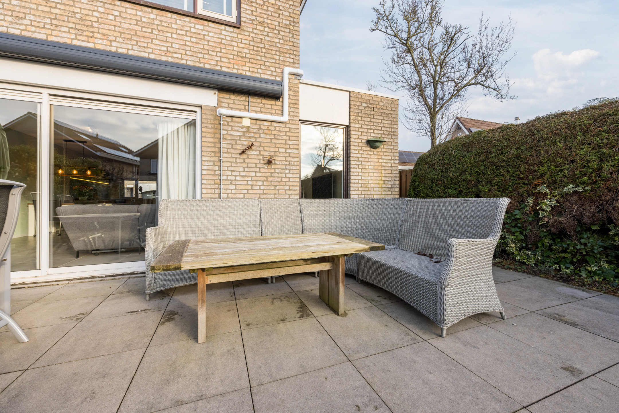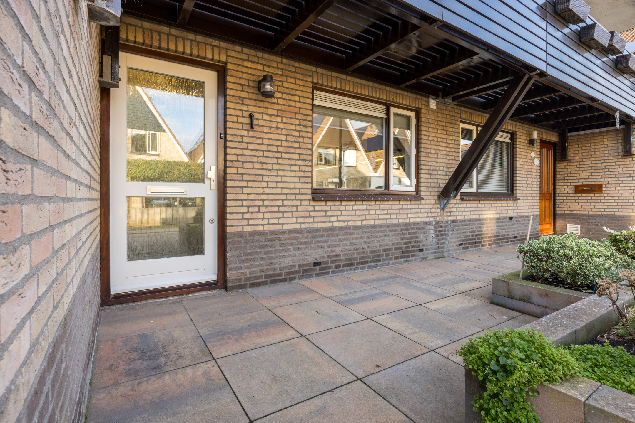 De voortuin is geheel betegeld en heeft een plantenborder. Naast de garage staat een extra berging en aan de zijkant is een afsluitbare poort naar de achtertuin.