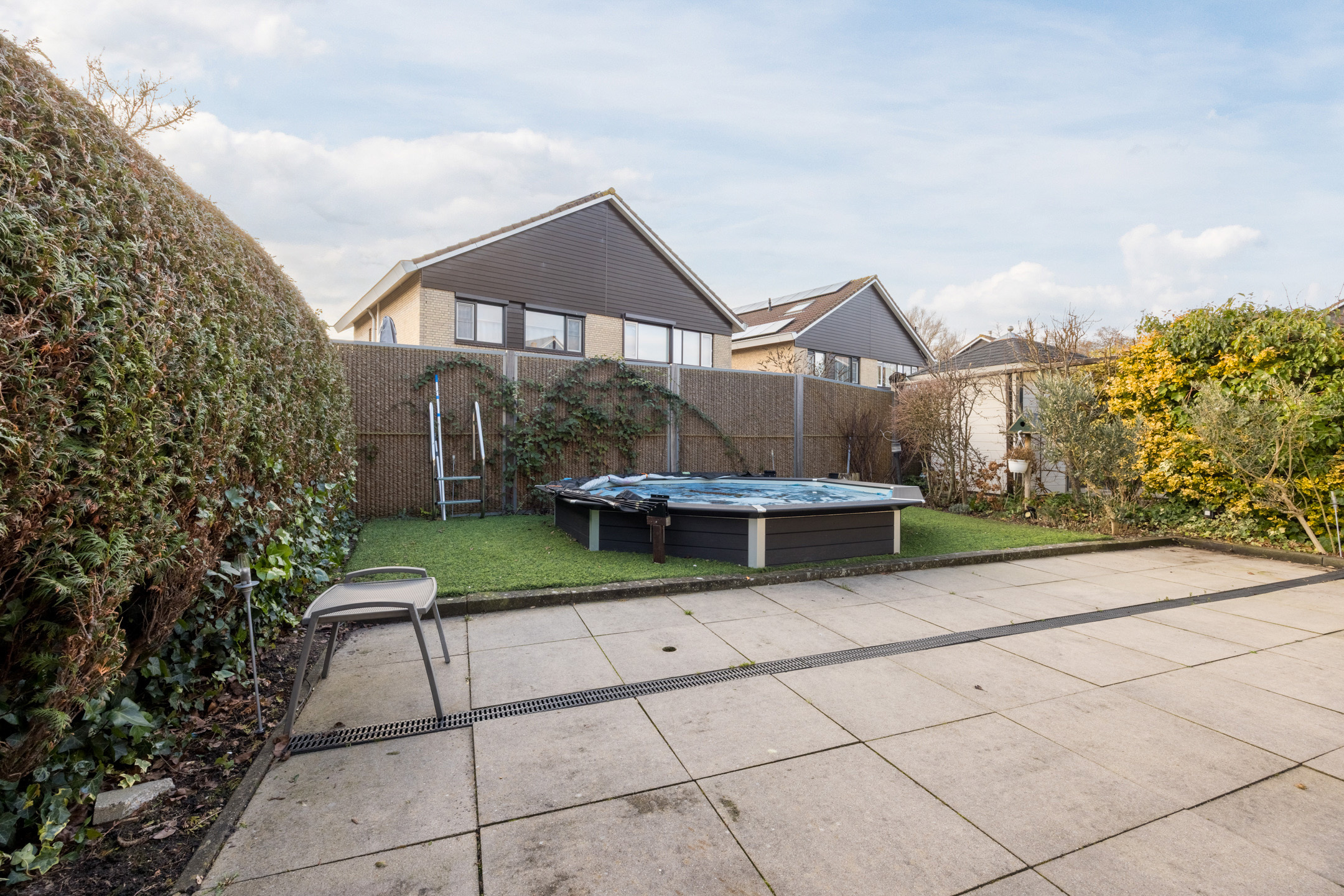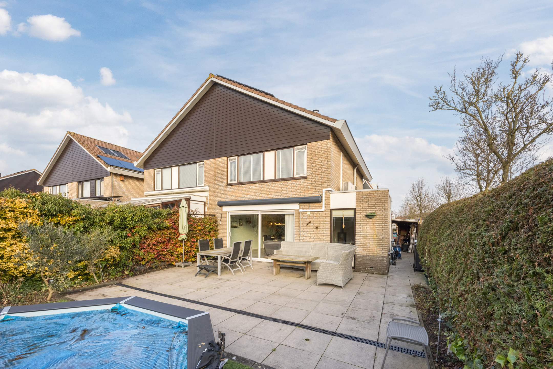 De zonnige achtertuin, gelegen op het zuidwesten, is sfeervol aangelegd en grotendeels betegeld. Het verwarmde zwembad is een heerlijke luxe tijdens warme, zonnige dagen. Daarnaast is aan de achtergevel een elektrisch bedienbaar zonnescherm geplaatst, waardoor je eenvoudig zowel zon als schaduw kunt creëren!